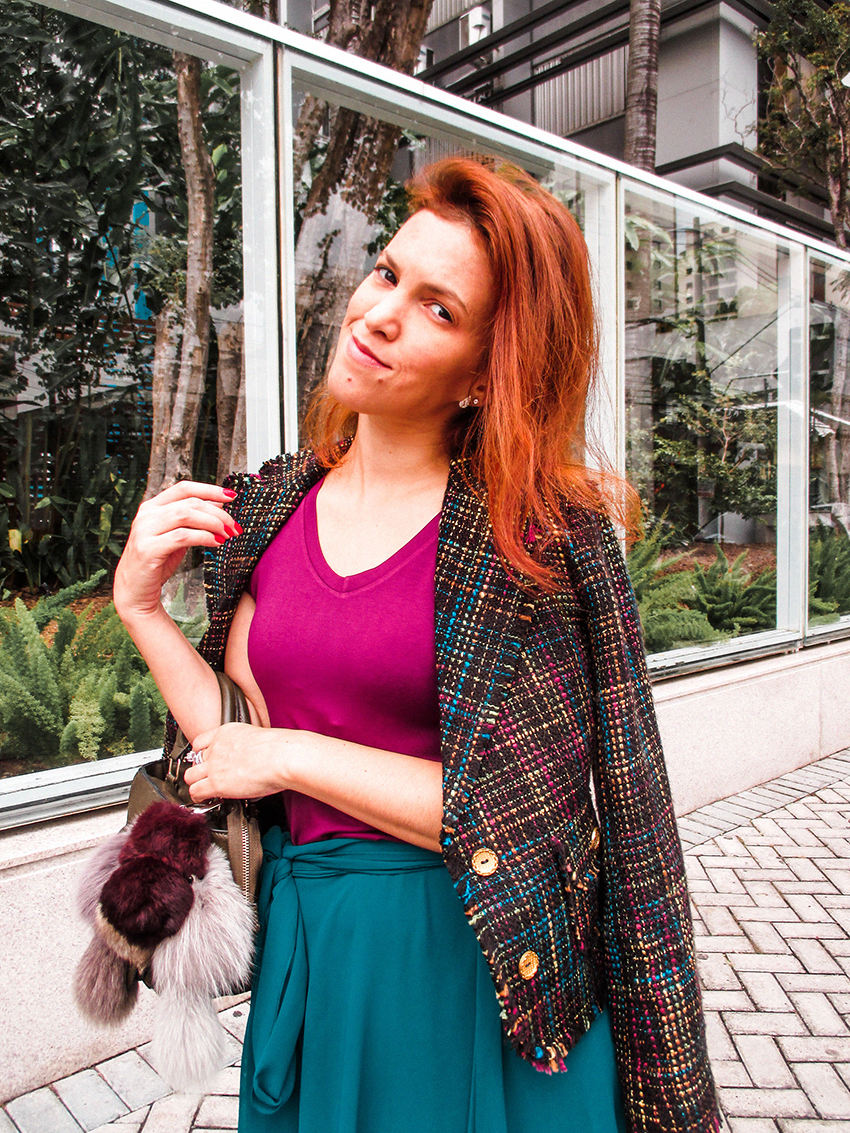 E pra dar força ao outfit por causa do tweed, decidi colocar coturno de salto com meia verde.
